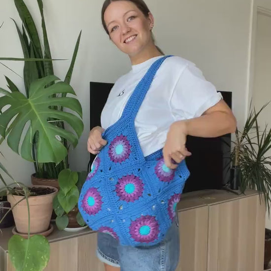 This pattern includes in depth detail and photos of all steps. You will learn how to do multiple stitches, crochet starburst granny square, connect them in a bag from and add straps and border.